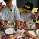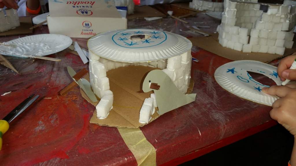 Kolejnym tematem było „SŁODKIE IGLO”. Tu uczestnicy z kostek cukru budowali budowlę kształtem zbliżoną do Iglo. Zabawy było co niemiara a klej lał się strumieniami…