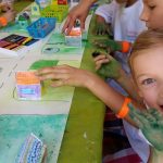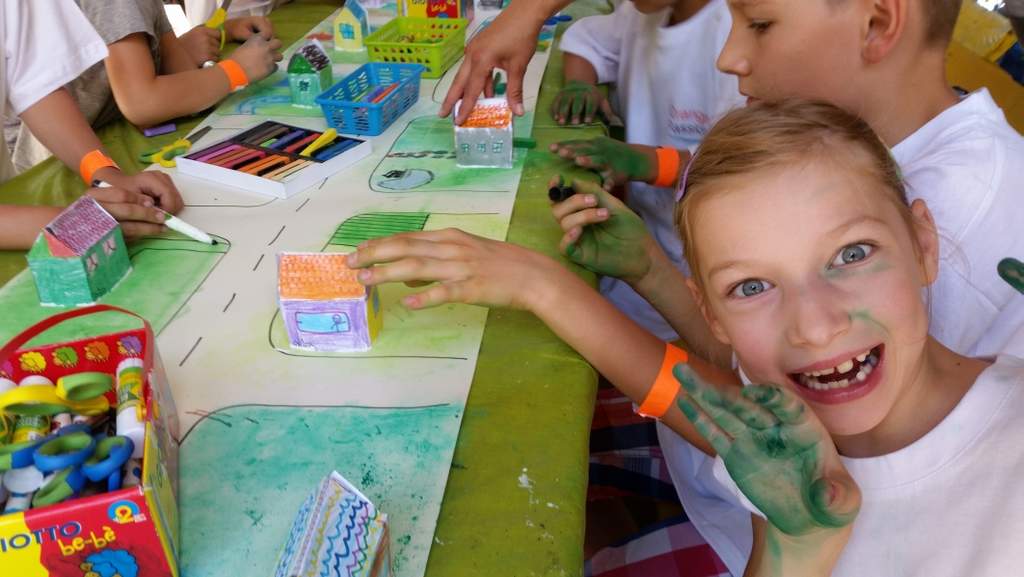 Podczas warsztatów “MIA100 POMYSŁÓW” na wspólnej planszy ,planie, dzieci budowały miasto stawiając na nim zrobione przez siebie budynki i planując przestrzeń dookoła nich.