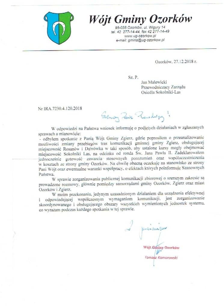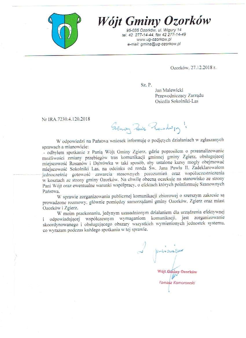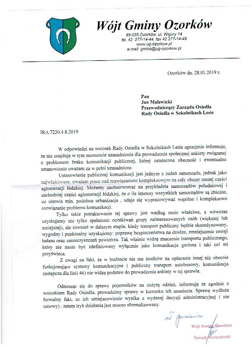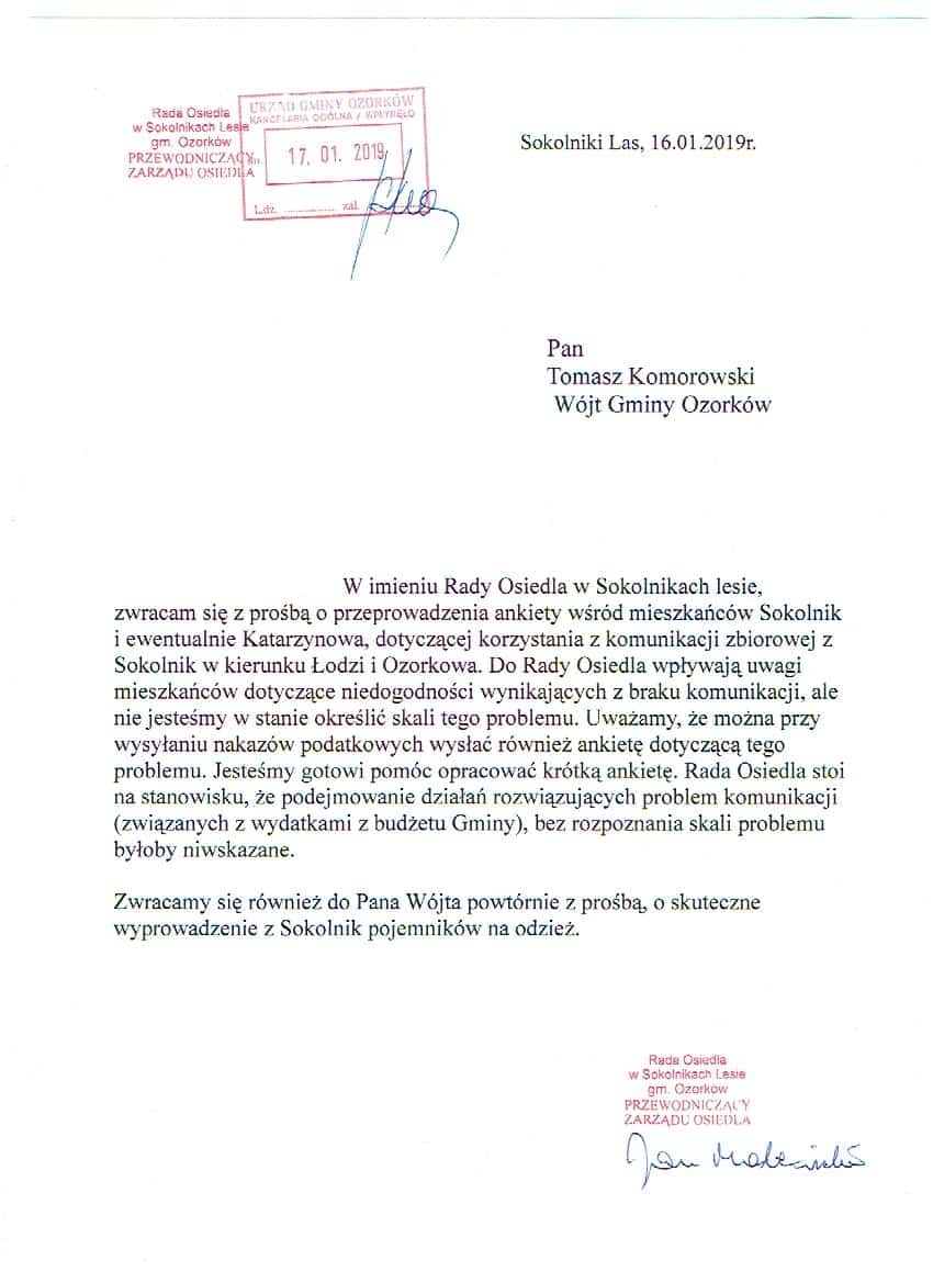 Korespondencja przewodniczącego rady osiedla z wójtem w sprawie transportu