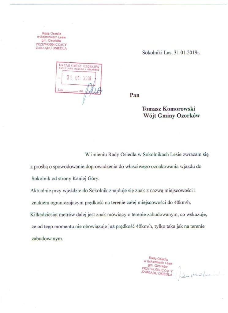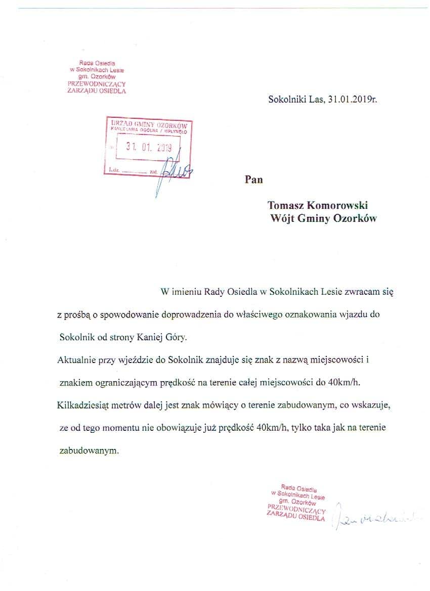 Prośba o zmianę oznakowania wjazdu do Sokolnik Lasu