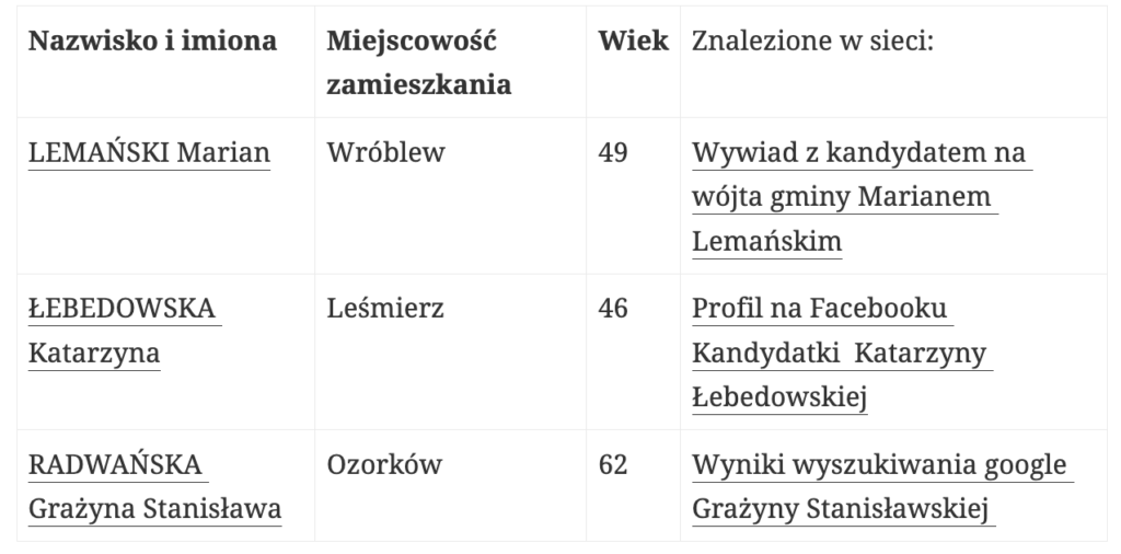 Nazwisko i imiona | Miejscowość zamieszkania | Wiek | Znalezione w sieci: |