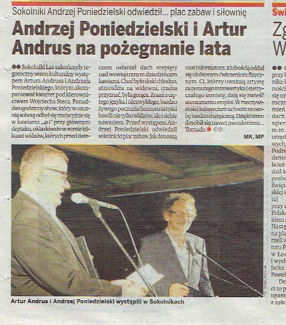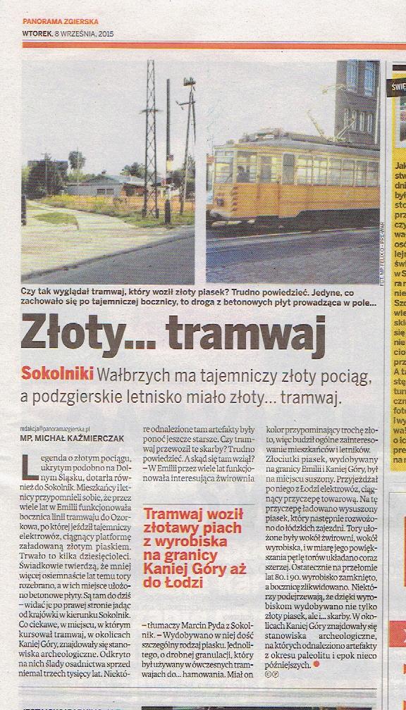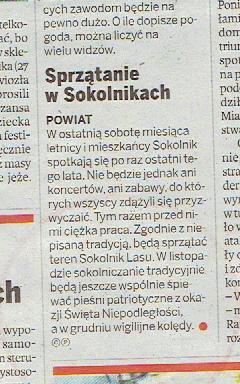 PANORAMA ZGIERSKA, tygodnik relacjonujący aktualne wydarzenia z rejonu Powiatu Zgierskiego, znów zamieściła wiele informacji promujących Sokolniki Las. Zaanonsowana na pierwszej stronie pojawiła się informacja o niegdysiejszym tramwaju wożącym piach wydobywany na granicy Emilii i Kaniej Góry, informacja o wrześniowym SPRZĄTANIU SOKOLNIK, relacja z występu A. Andrusa i A. Poniedzielskiego w Kawiarni „40” oraz zapowiedź budowy skate-parku. Jeden z artykułów dotyczył problemu z włamaniami, jakie ostatnio zdarzają się w okolicy. Co prawda opisana została sytuacja Rosanowa, ale niedawno do podobnych zdarzeń doszło także w Sokolnikach. Warto relację tę przeczytać i wziąć sobie do serca.