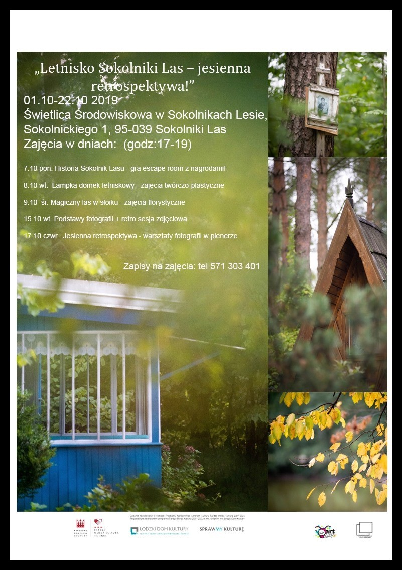 Zapraszam na autorski projekt „Letnisko Sokolniki las – jesienna retrospektywa!”, a gdzie, no jakby nazwa mówi sama za siebie, pomiędzy Zgierzem a Ozorkowem nas znajdziecie. Projekt jest finansowany z Narodowego Centrum Kultury, w ramach działań Bardzo Młoda Kultura, realizatorem na województwo łódzkie jest Łódzki Dom Kultury, który wybierał inicjatywy w ramach konkursu, dzięki czemu trafiło się i mnie ;) Projekt został stworzony z miłości do Sokolnik, z których po części pochodzą moi pradziadkowie, ewoluował w głowie dość długo, aż wreszcie udało się go okiełznać w ramy. Wszystkie zajęcia odbędą się w lokalnej świetlicy środowiskowej, z założenia pierwszą grupą docelową są dzieci i młodzież z Sokolnik Lasu, tj. m.in. uczniowie dwóch lokalnych najbliższych podstawówek z Modlnej i ze Słowika. W projekcie wziąć mogą również dorośli, wstępnie są to czytelnicy lokalnej biblioteki z Sokolnik Lasu, ale także mieszkańcy regionu, z wolnego naboru. Do działań zostały zaproszone świetlice filie, Gminnego Ośrodka Kultury w Leśmierzu – placówki z Cedrowic i z Sierpowa, z najbliższych okolic letniska, związku z tym, pewne terminy warsztatów z automatu zostały już zapełnione, aby nasze moce przerobowe były realne. Termin 7.10 zostało jeszcze 10 miejsc, termin 8.10 śmiało sporo miejsc, 9.10 lasy w słoikach, 50 osób, full, 15.10 full zajęte, 17.10 są jeszcze miejsca. Zapisy poprzez kontakt telefoniczny, który widnieje na plakacie, do instruktorki świetlicy w Sokolnikach Lesie, która jest najbardziej na bieżąco.